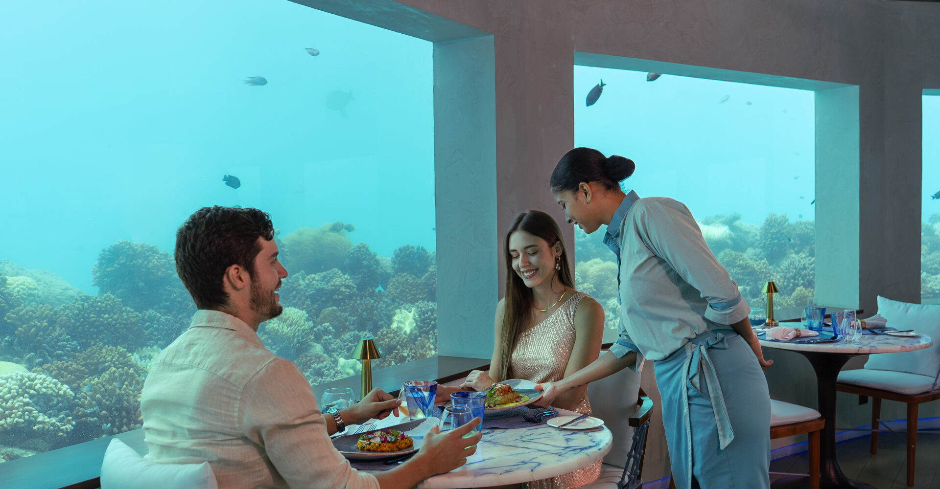 Explore a world of exquisite flavours at OBLU SELECT Lobigili with three restaurants (one under the ocean) and a standout bar with poolside seating as well as hammocks and swings.